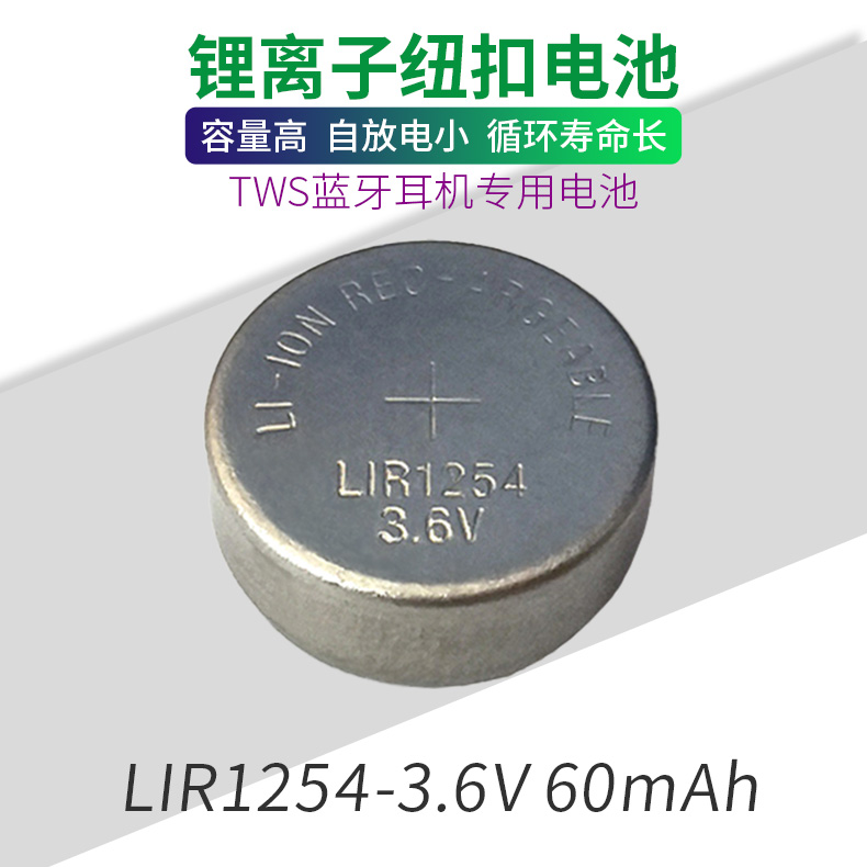 真明LIR1254紐扣電池是一款3.6V可充電鋰離子紐扣電池,電池容量60mAh,最大放電倍率2C。??同時(shí)它也是一款?的藍(lán)牙耳機(jī)?專用?電池,常用于TWS藍(lán)牙耳機(jī)。