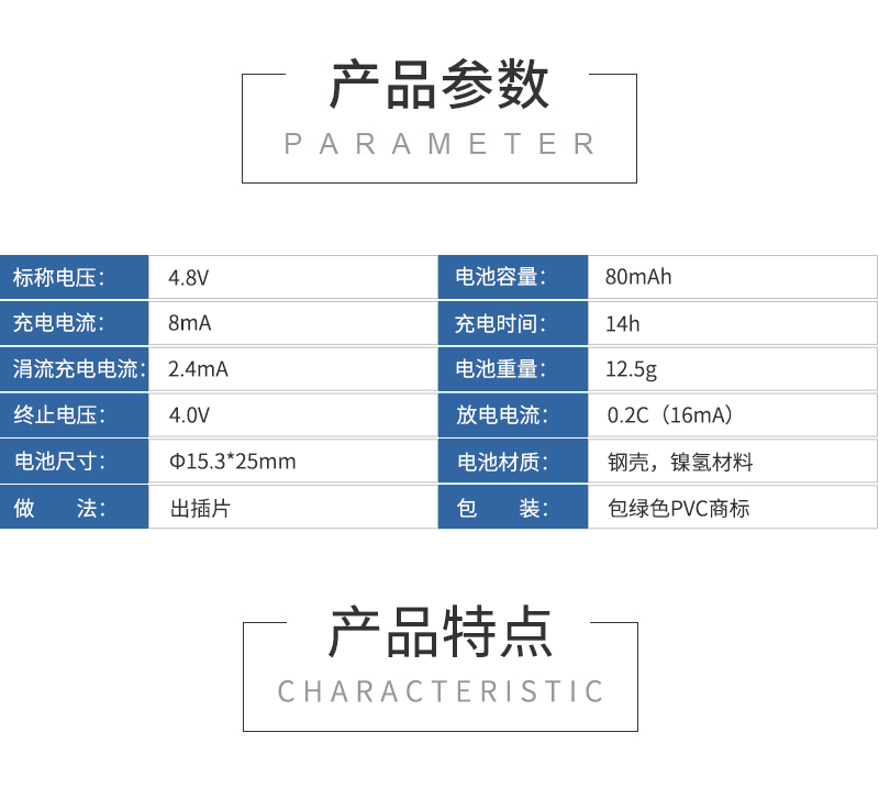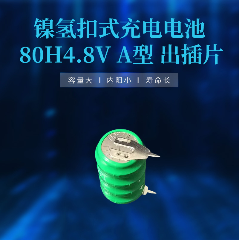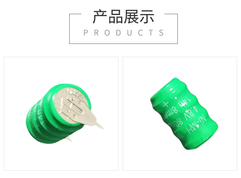 80H 4.8V帶腳鎳氫扣式電池是由4個80H扣式鎳氫電池層疊串聯組合而成的柱形鎳氫充電電池,其電壓為4.8V,容量80mAh,可根據客戶要求提供個性化定制加工。