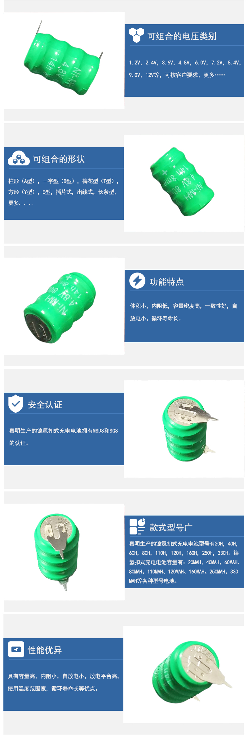 可串聯組合不同電壓:如2.4V、3.6V、4.8v、6.0V、7.2V、8.4V、9.0V、12V等