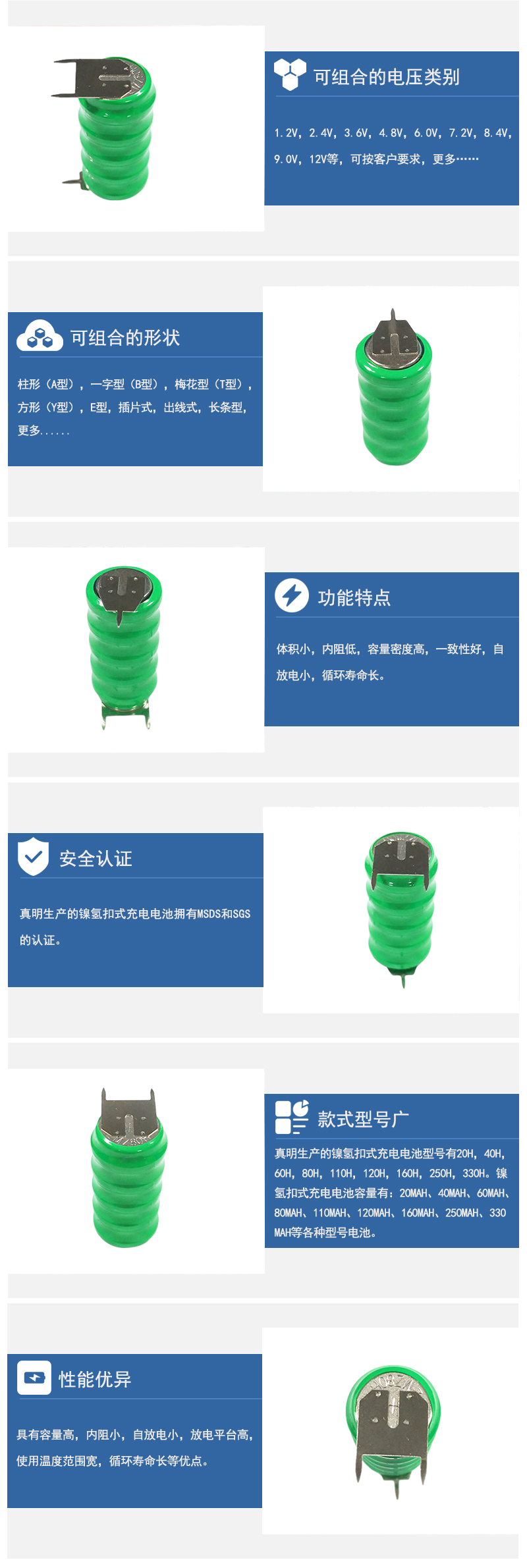 可串聯組合不同電壓:如2.4V、3.6V、4.8v、6.0V、7.2V、8.4V、9.0V、12V等