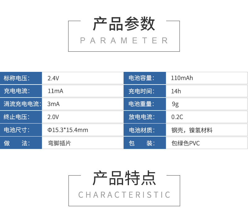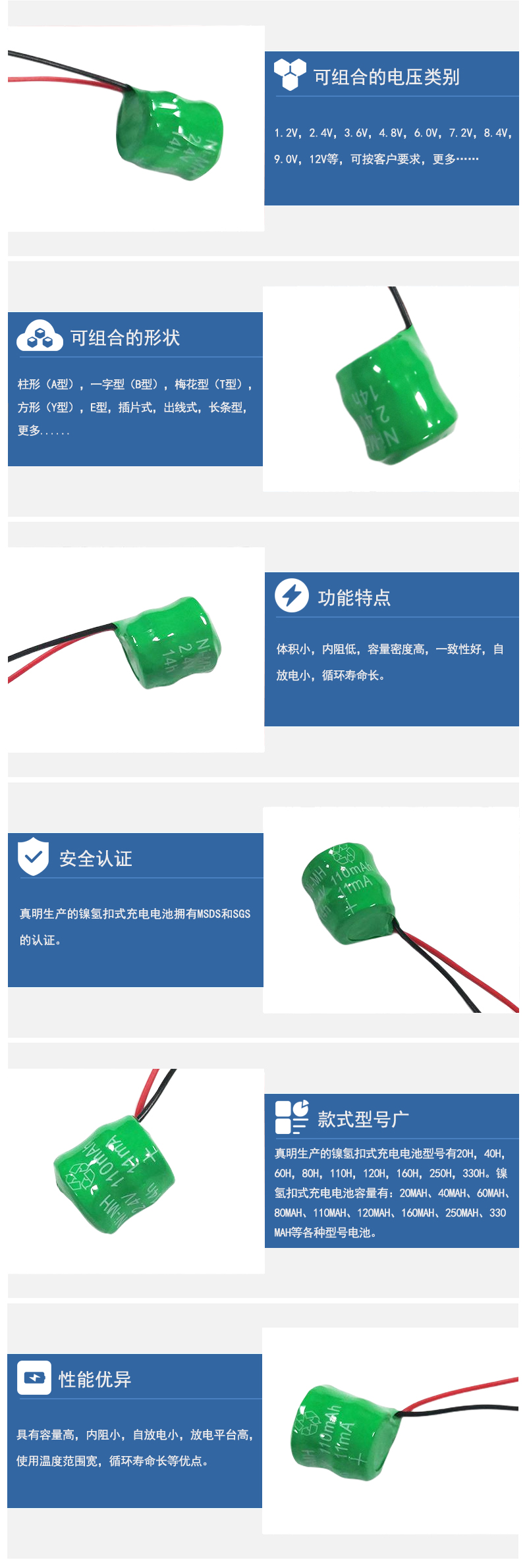 110H 2.4V帶線鎳氫扣式電池是由2個110H扣式鎳氫電池層疊串聯組成而成的柱形鎳氫充電電池,其電壓為2.4V,容量20mAh,可根據客戶要求提供個性化定制加工。