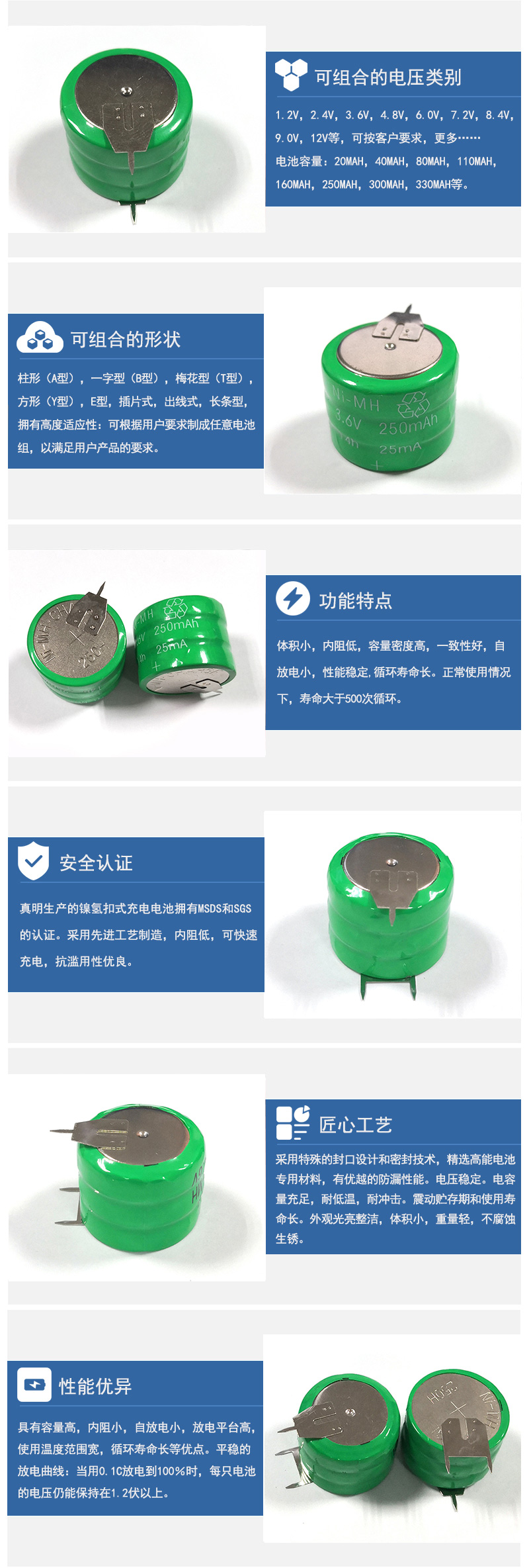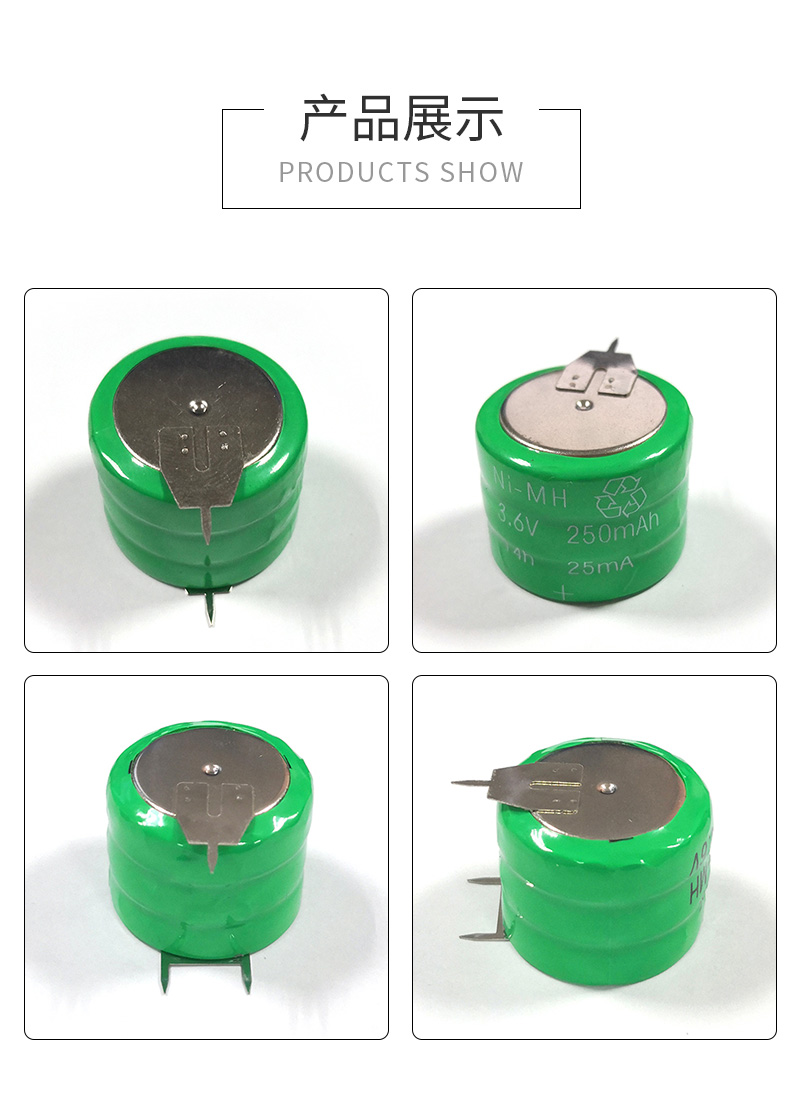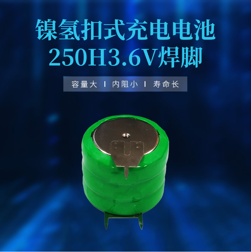 250H 3.6V帶腳鎳氫扣式電池是由3個250H扣式鎳氫電池層疊串聯(lián)組合而成的柱形鎳氫充電電池,其電壓為3.6V,容量250mAh,可根據(jù)客戶要求提供個性化定制加工。