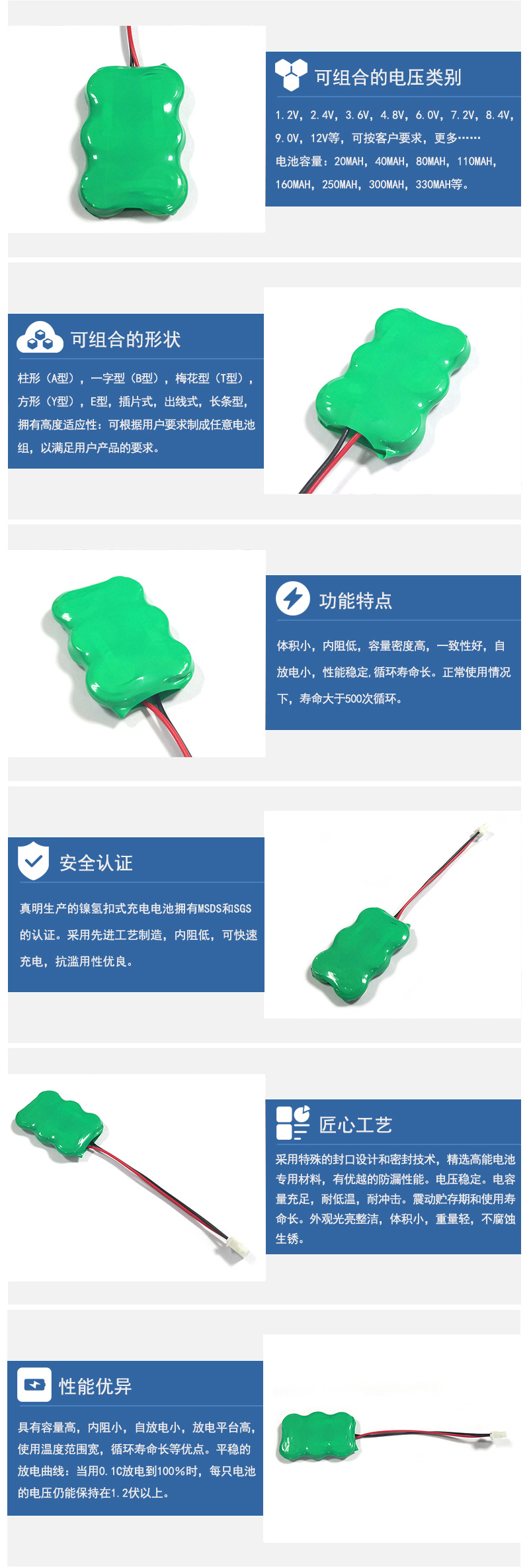 可串聯(lián)組合不同電壓:如2.4V、3.6V、4.8v、6.0V、7.2V、8.4V、9.0V、12V等
