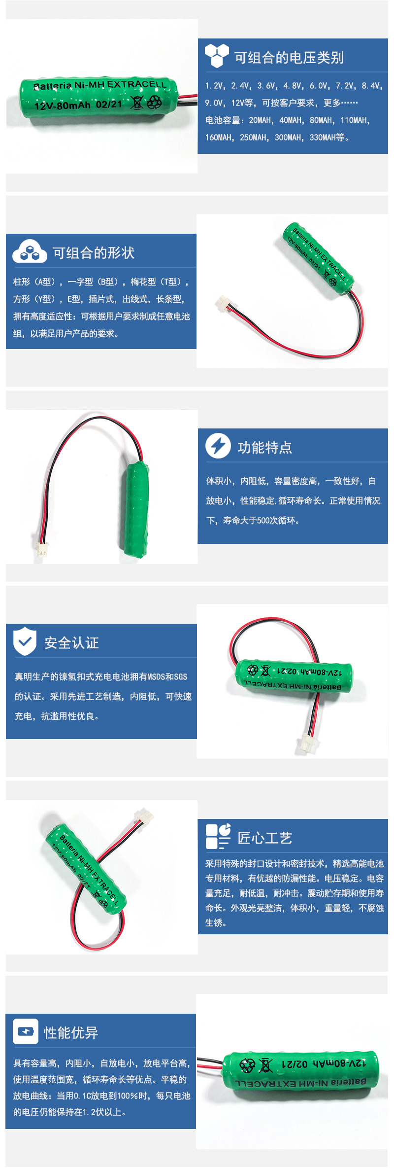 可串聯組合不同電壓:如2.4V、3.6V、4.8v、6.0V、7.2V、8.4V、9.0V、12V等